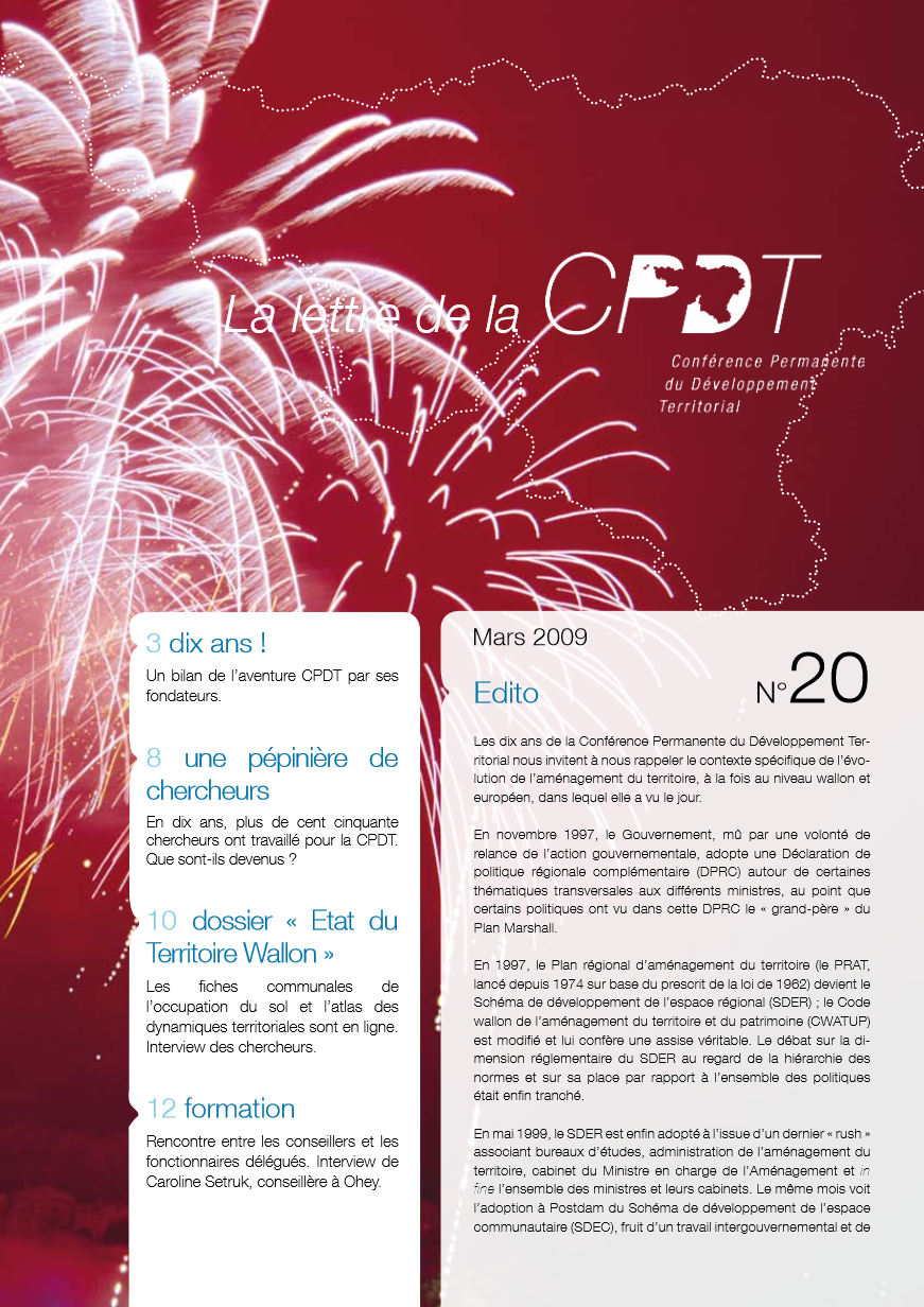Dossier : Etat du Territoire Wallon. Mais aussi : Dix ans! – Un bilan de l’aventure CPDT par ses fondateurs. – Une pépinière de chercheurs. Formation : Rencontre entre les conseillers et les fonctionnaires délégués. Interview de Caroline Setruk.
