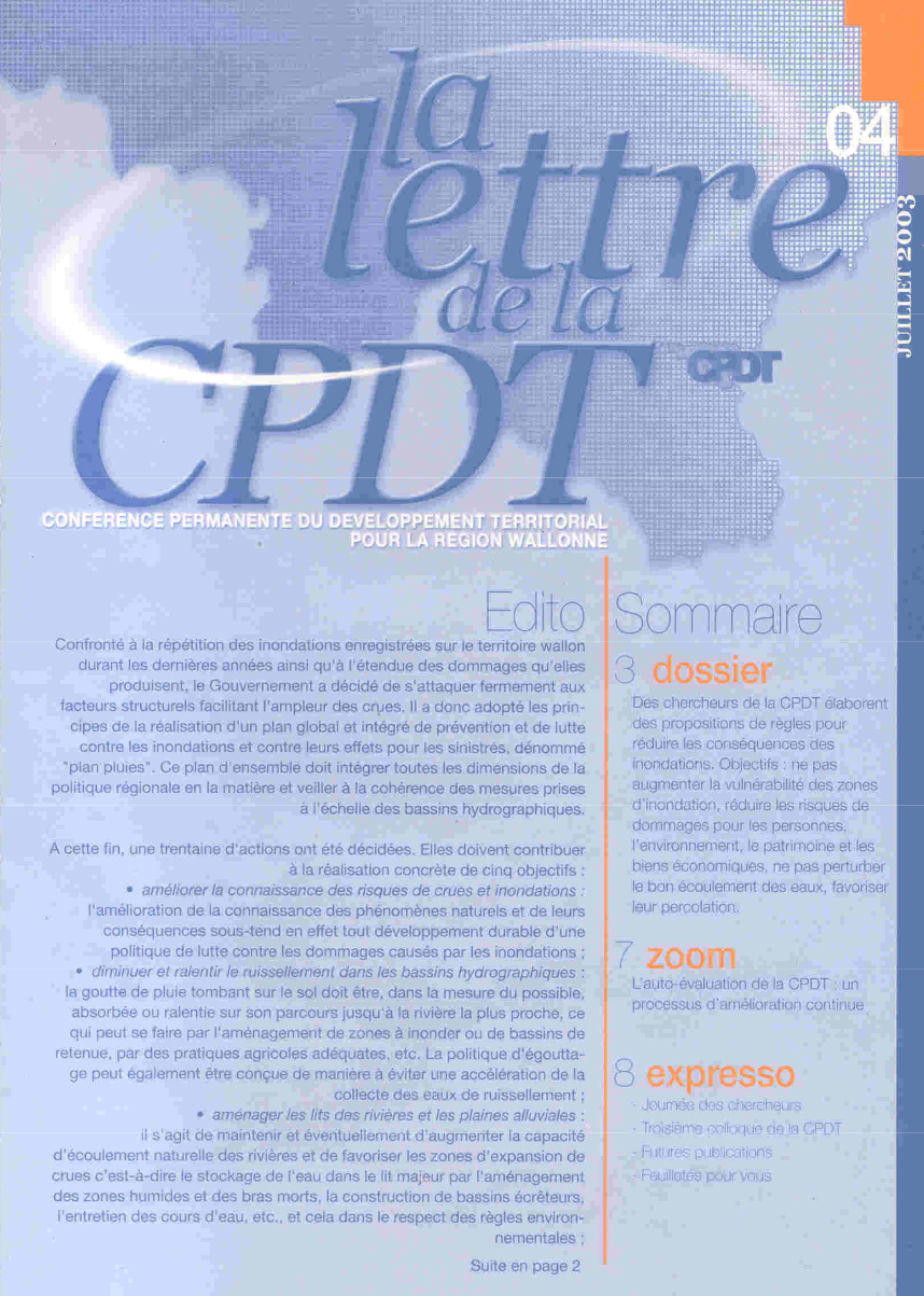 Dossier : réduire les effets des inondations. Mais aussi : l’auto-évaluation de la CPDT, la journée des chercheurs, les publications sous presse.