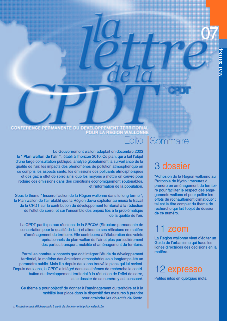 Dossier : les mesures à prendre en aménagement du territoire pour respecter le Protocole de Kyoto. Mais aussi : présentation du Guide de l’urbanisme, aperçu du Tableau de Bord du Développement Territorial.