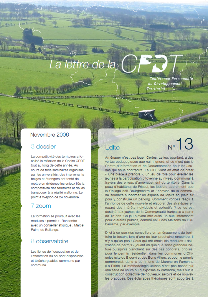 Suite à la décision du Gouvernement wallon du 21 septembre 2006, Monsieur le Ministre Antoine a invité la CPDT à lui transmettre pour la fin décembre 2006 l’état des lieux en matière de consommation d’espace et de perspectives des besoins pour les zones affectées ou à affecter à l’extraction. Les conclusions de cette mission d’expertise doivent préciser la quantification de la planimétrie des zones d’extraction, le taux de consommation de l’espace, effective ou incluant des projets en cours, ainsi que la localisation raisonnée de futures zones d’extraction.